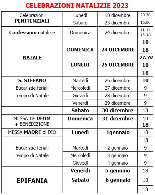 Ore 10,00 S. Messa — Ore 18,00 S. Messa Notte di Natale — Ore 21,30 S. Messa Notte di Natale |