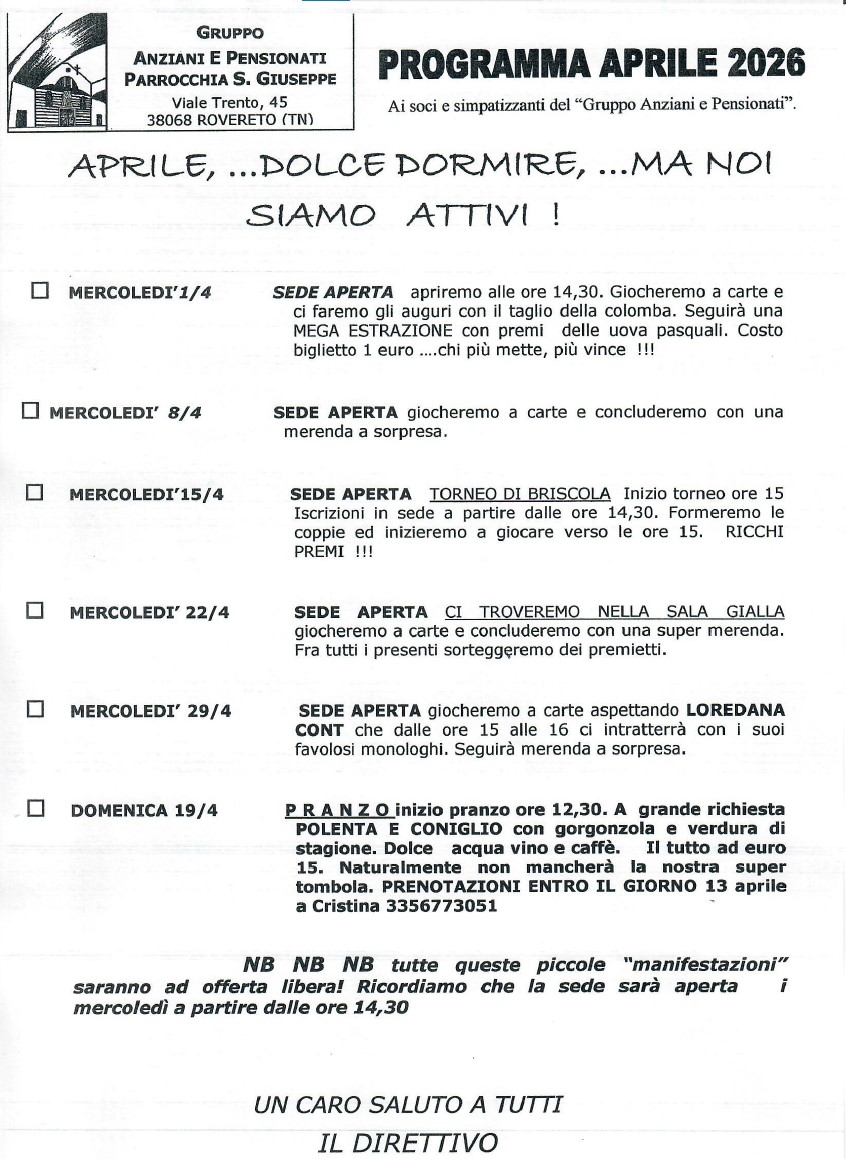 Programma APRILE 2026 del Gruppo Anziani e Pensionati Pubblicato il 25 Marzo 2026 Condividi:FacebookGoogleTwitterLinkedin