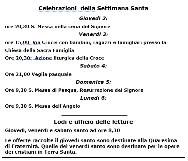 | Mercoledì 1 aprile | Ore 9,00 Liturgia delle Ore |