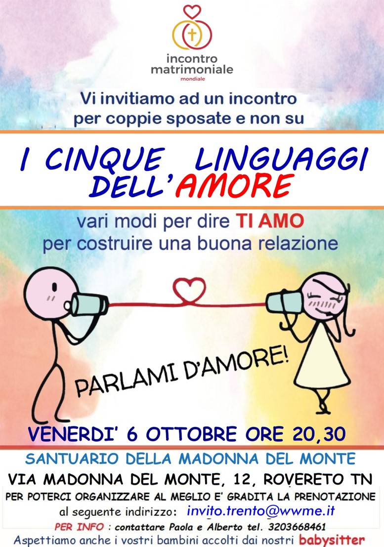 I CINQUE LINGUAGGI dell’AMORE Quando 06/10/2023 0:00 Aggiungi al calendario Download ICS Google Calendar iCalendar Office 365 Outlook Live Dove Santuario della Madonna del Monte via Madonna del Monte 12, Rovereto Condividi:FacebookGoogleTwitterLinkedin